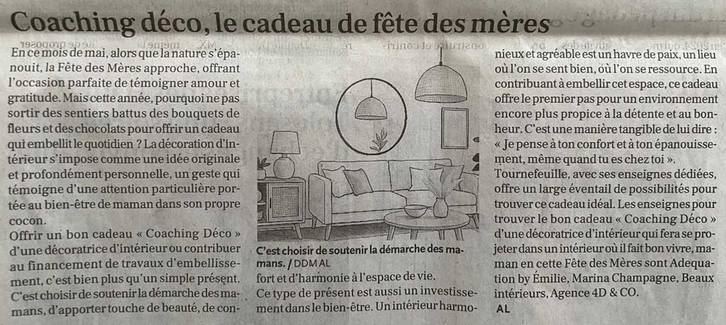 Citation de l’article : « Les enseignes pour trouver le bon cadeau ‘Coaching Déco’ d’une décoratrice d’intérieur qui fera se projeter dans un intérieur où il fait bon vivre, maman en cette Fête des Mères sont Adequation by Émilie, Marina Champagne, Beaux intérieurs, Agence 4D & CO. »