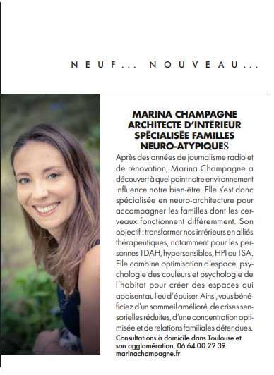 Citation dans l’article : « Après des années de journalisme radio et de rénovation, Marina Champagne a découvert à quel point notre environnement influence notre bien-être. Elle s’est donc spécialisée en neuro-architecture pour accompagner les familles dont les cerveaux fonctionnent différemment. »